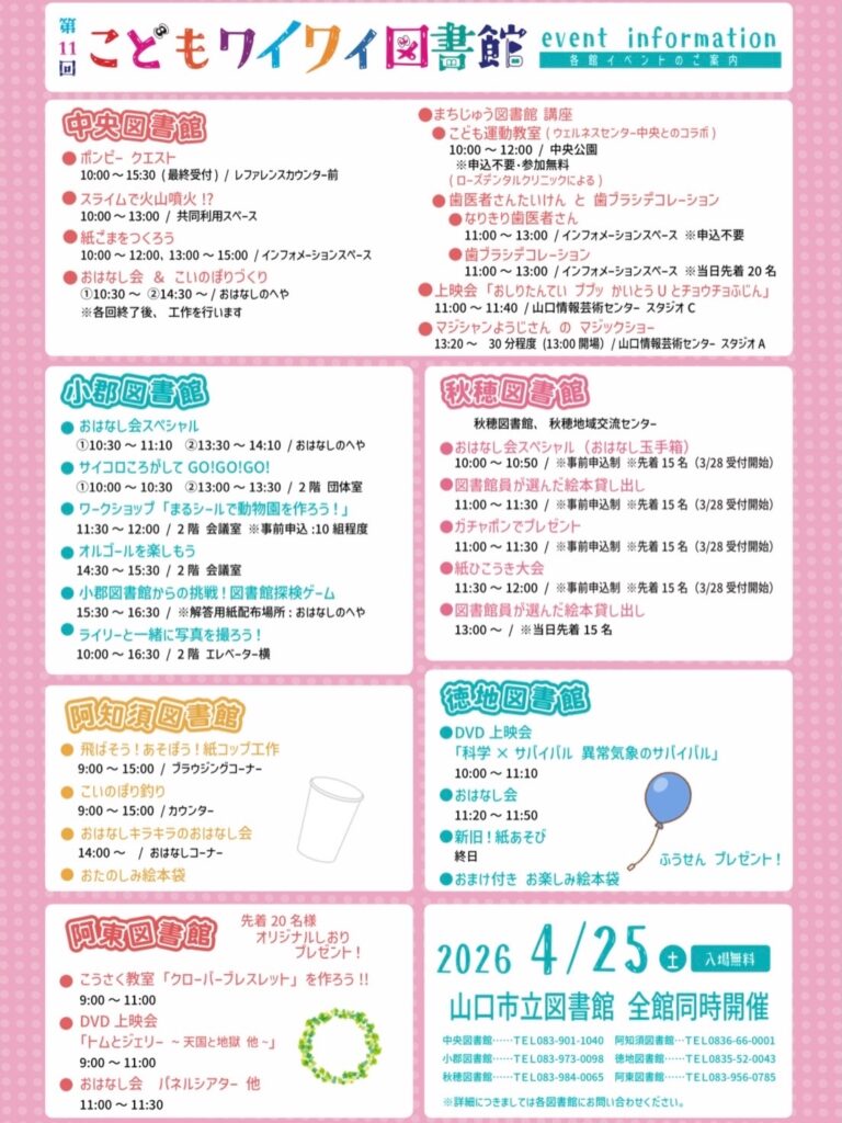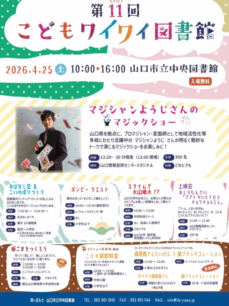 CONTENT コンテンツ TOP CONTENT 【出演情報】第11回こどもワイワイ図書館 ブログ 2026/04/25 【出演情報】第11回こどもワイワイ図書館 2026年4月25日(土)10:00~16:00山口県山口市 山口市立中央図書館にて第11回こどもワイワイ図書館が開催されます!13:20~山口情報芸術センタースタジオAにてマジックショーでお邪魔させていただきます!!ほかにもご家族で参加したくなるイベントもたくさん!ぜひみなさん遊びに来てくださいね backback to allnext RELATED ARTICLES ブログ 2026/04/25 【出演情報】道の駅おふく創業記念祭 ブログ 2026/04/25 【出演情報】第11回こどもワイワイ図書館 ブログ 2026/02/22 今年も開催!いもフェス山口2026!! ブログ 2026/02/07 【出演情報】イオンタウン楽々園 ブログ 2025/12/31 【新年のご挨拶】 ブログ 2025/11/01 【出演情報】周南物産展にてマジックショー! ブログ 2025/09/18 【緊急告知!】マジックショーin River Roll ブログ 2025/08/22 MK SHOW and LECTUREご来場御礼 ブログ 2025/08/13 【河原夏祭り】【出演情報】山口市鋳銭司の夏祭りでマジックショー! 出演情報 2025/08/12 【2025年8月13日】【出演情報】プレミアホテル門司港でマジックショー開催!
